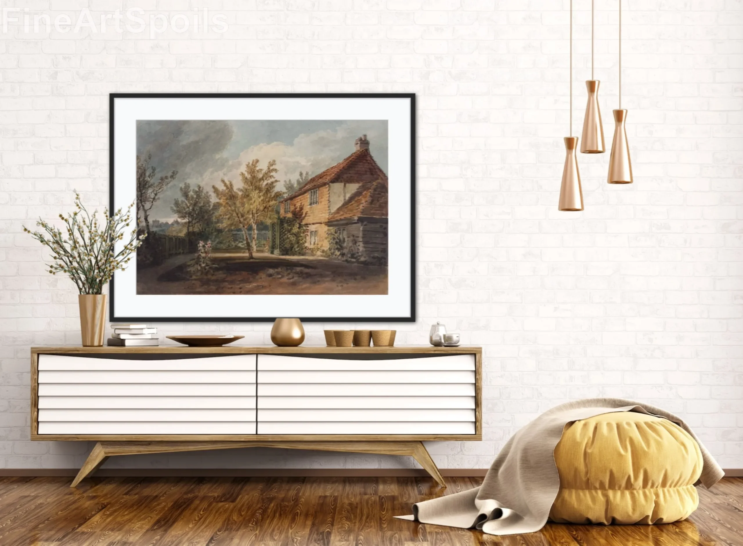 Enhance your space with this exquisite fine art reproduction of J.M.W. Turner’s A Country Cottage, originally painted in 1799. This early masterpiece showcases Turner’s burgeoning genius for capturing light and atmosphere. The scene features a charming timber-framed cottage bathed in the soft, shifting light of a late 18th-century afternoon, surrounded by delicate trees and a rustic garden. Perfect for collectors of Romanticism and classical English landscapes.