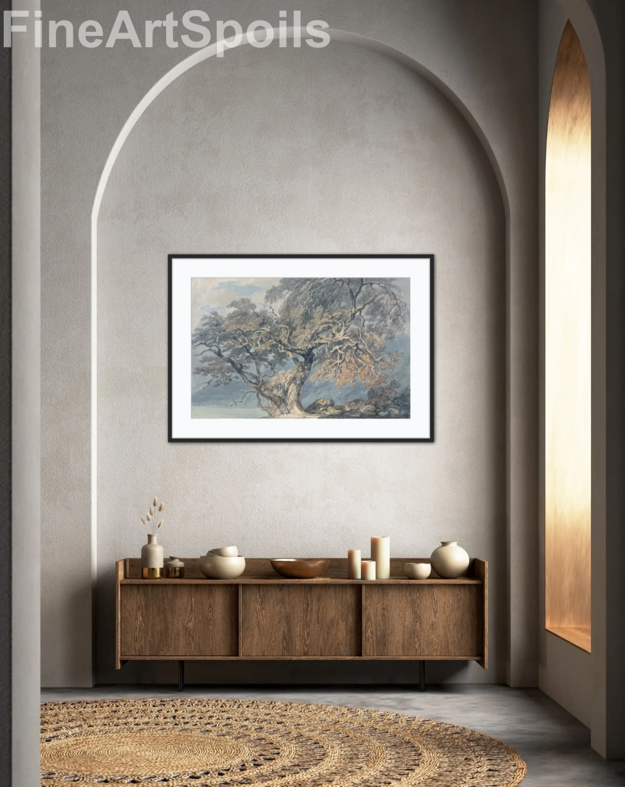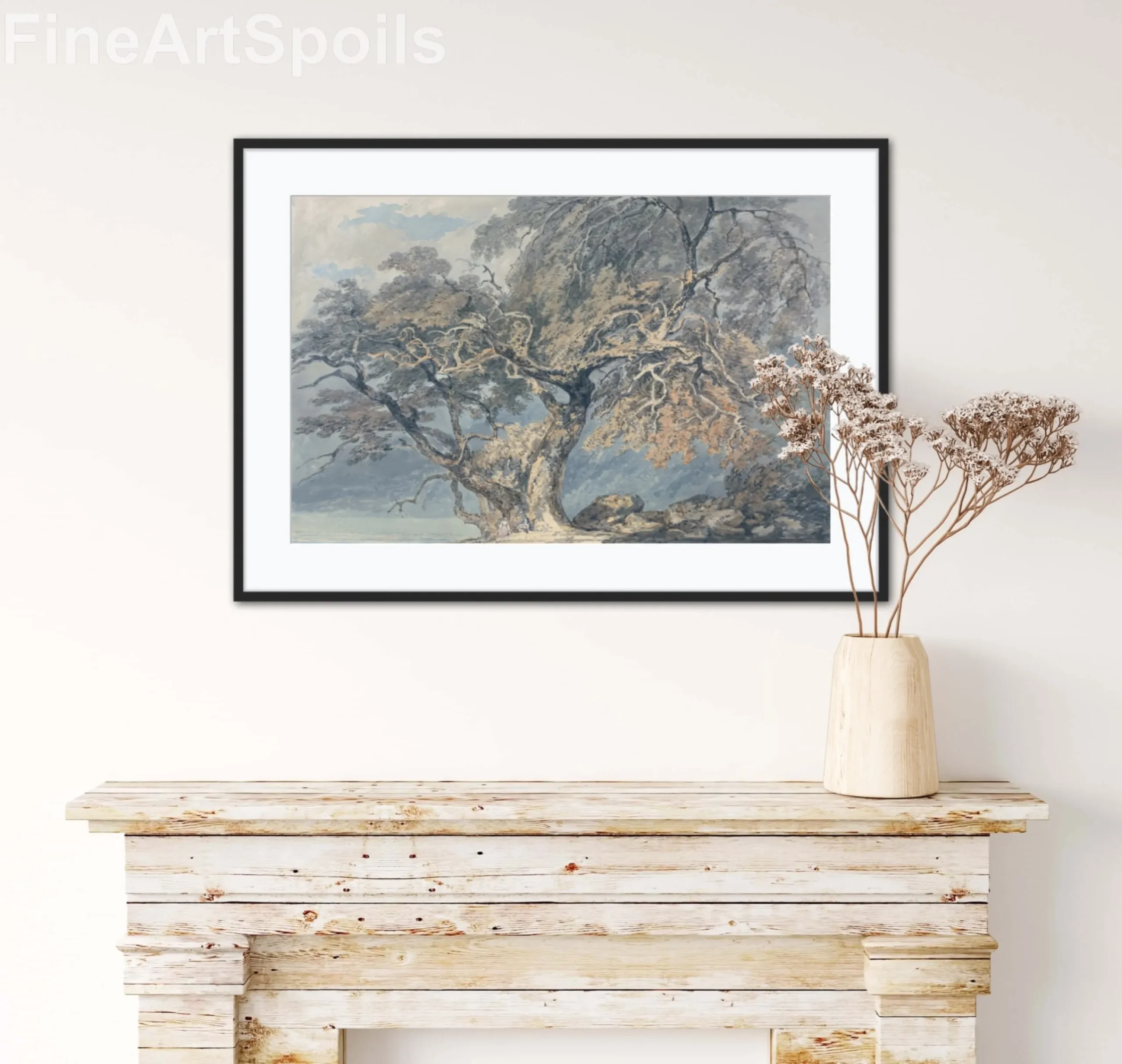 Bring the masterful touch of Britain’s greatest landscape painter into your home with this exquisite reproduction of J.M.W. Turner’s A Great Tree (1796). This early work showcases Turner’s burgeoning genius for capturing the raw, intricate beauty of nature. The composition centers on a majestic, gnarled tree with sprawling branches that dominate the frame, rendered in a sophisticated palette of earthy ochres, muted greys, and soft blues. Perfect for collectors of Romanticism and classical English art, this high-quality print preserves the delicate watercolor textures and atmospheric depth of the original masterpiece.