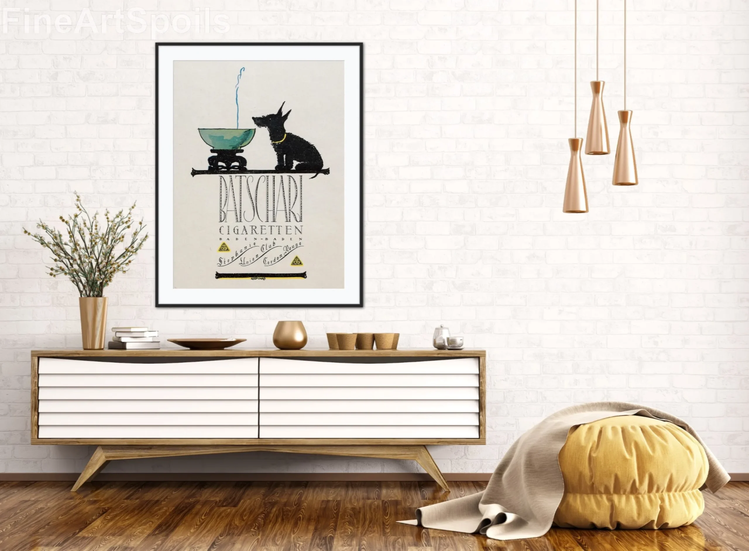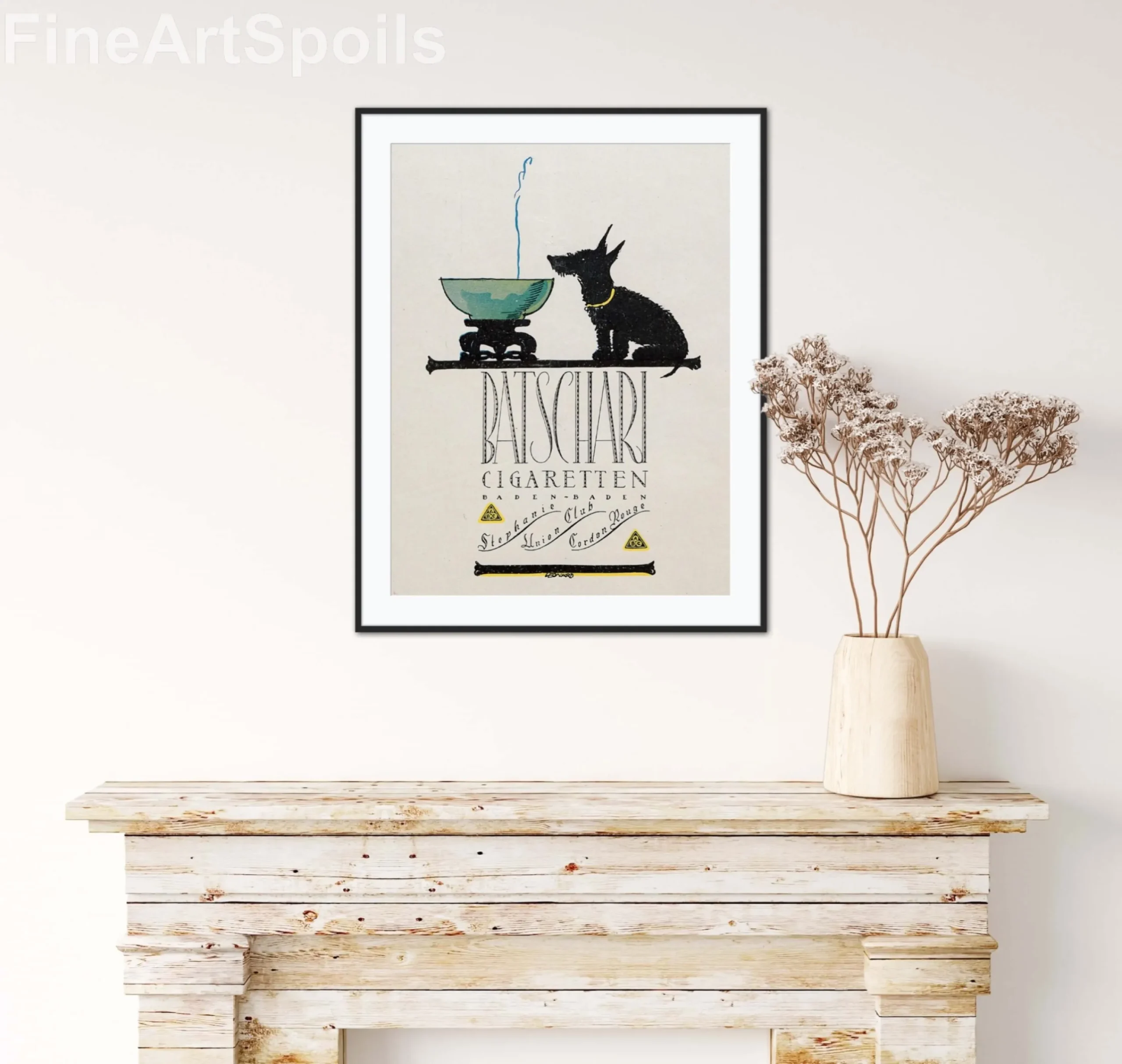 This piece features a charming, silhouetted Scottish Terrier gazing curiously at a steaming bowl, set against a minimalist off-white background. The artwork perfectly captures the Art Deco aesthetic, utilizing bold typography, clean lines, and a restrained color palette of teal, yellow, and deep black. The elongated, stylized lettering of “Batschari” serves as a focal point, showcasing the architectural influence on 1920s typeface design.