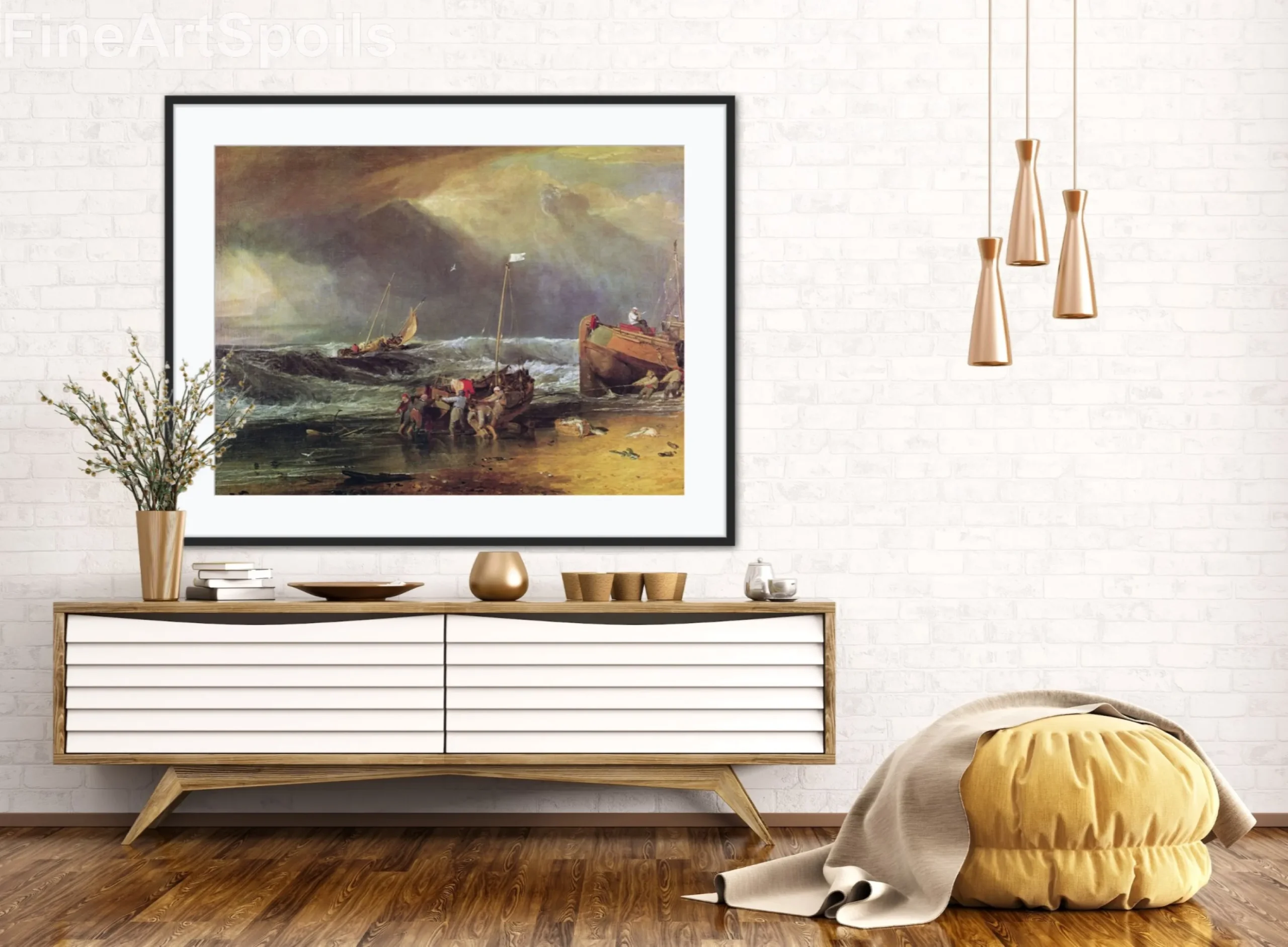 Bring the raw power of the ocean into your home with this stunning reproduction of J.M.W. Turner’s 1803 masterpiece. Known as the “painter of light,” Turner expertly captures the dramatic struggle between man and nature. This piece features a group of fishermen battling crashing waves to secure their vessel against a backdrop of brewing storm clouds. It is a quintessential example of English Romanticism, perfect for adding a sense of history and atmosphere to any living space or office.