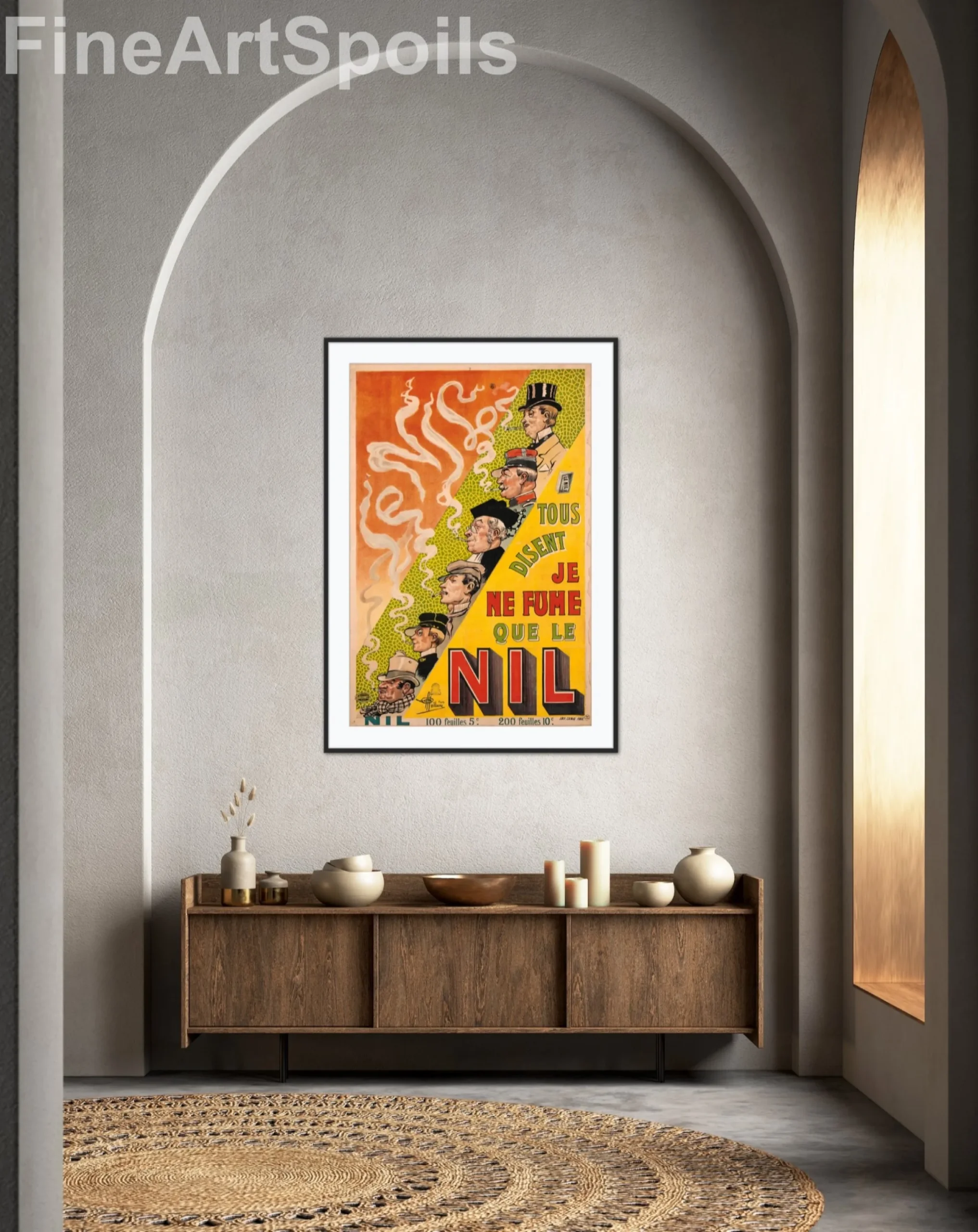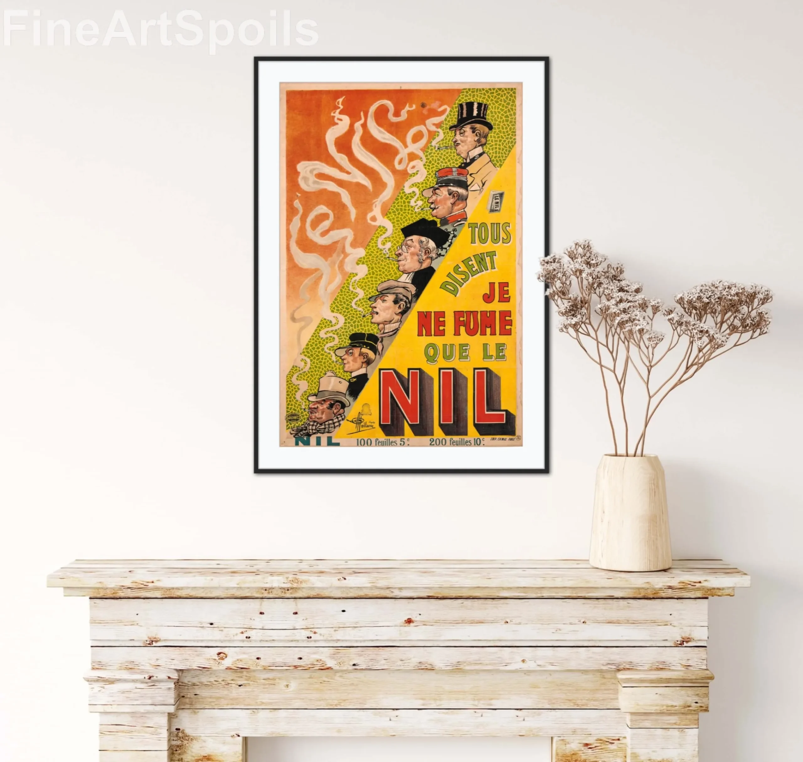 With its warm orange and yellow palette, intricate green patterned background, and the whimsical, swirling smoke that forms the brand name “NIL” in the air, this print brings a touch of historical French charm and sophisticated wit to any room.