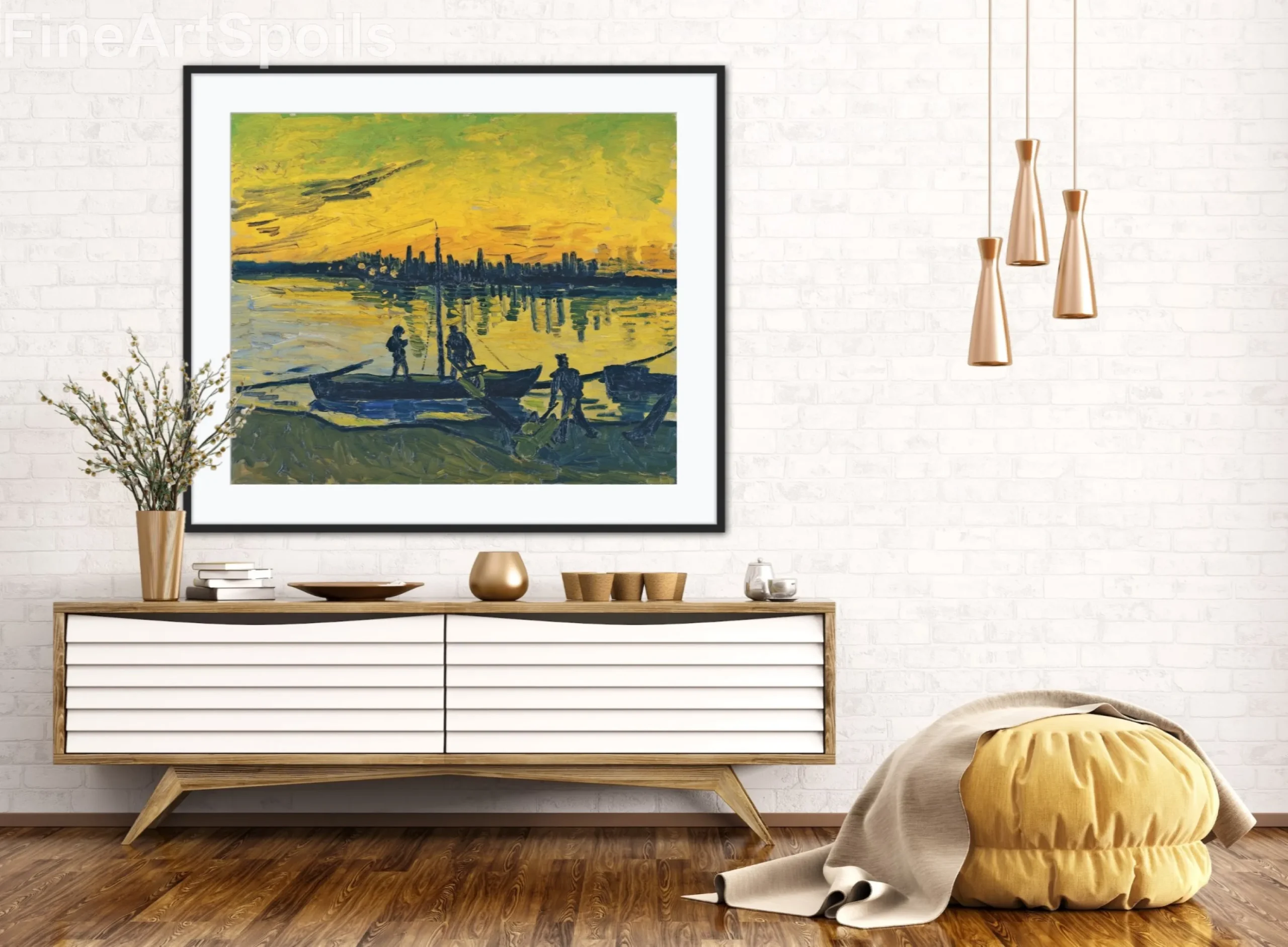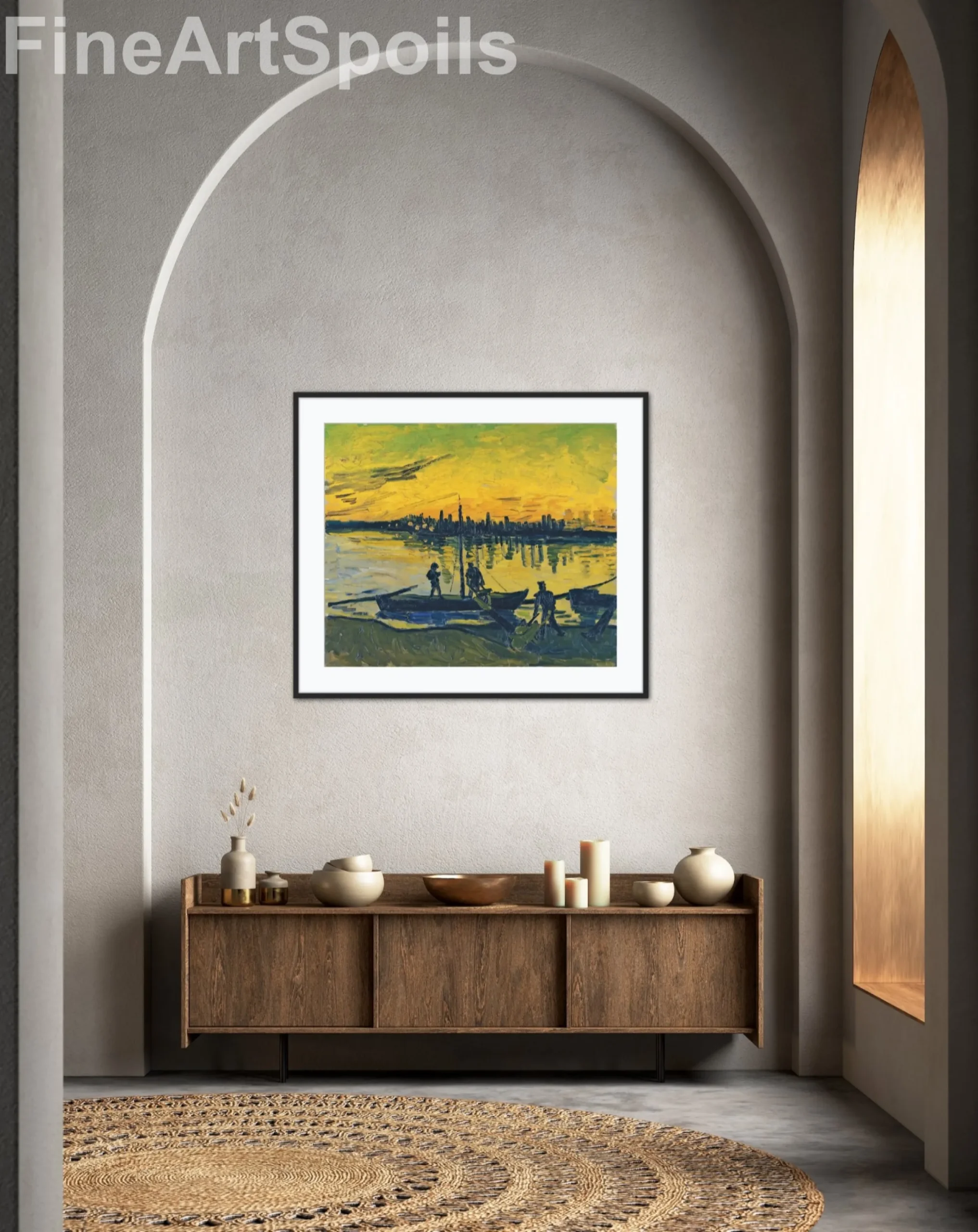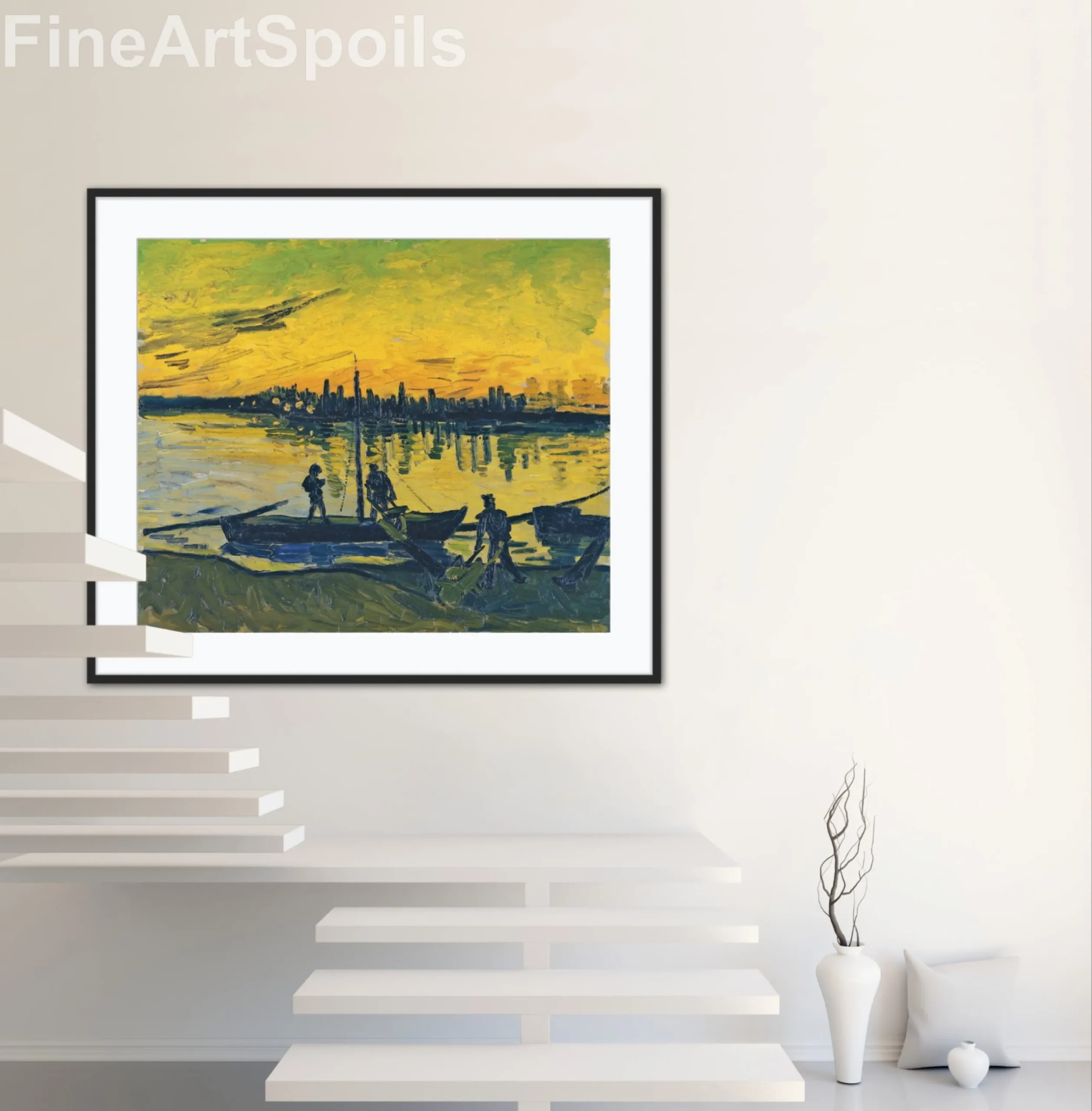 Bring the vibrant energy of 19th-century Provence into your home with this high-quality reproduction of Vincent van Gogh’s The Stevedores in Arles. Painted in 1888, this work captures a sunset over the River Rhône, where the water glows with intense yellows and oranges, contrasting sharply against the dark, silhouetted figures of the workmen and their boats.